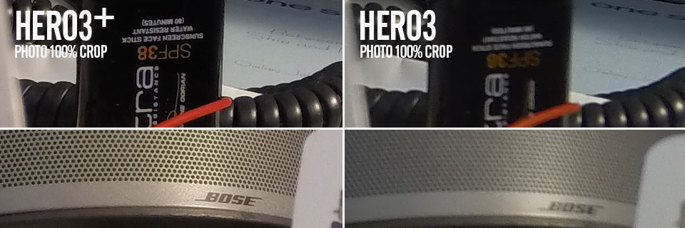 GoPro заявляют, что четкость изображения на новой камере увеличилась на 33%, что достаточно легко заметить на примерах ниже. Все дело опять же в линзах. Четкость на небольшом расстоянии заметна сильнее, чем при удалении объекта от камеры. Фото далеких объектов схоже по четкости с камерой HERO3. Во время тестов я использовал один и тот же чехол для камер, активировал камеры с помощью пульта, чтобы не смазать фото. Оба кадра это вырезки из полноценных, которые я ничем не дорабатывал. Камеры были на расстоянии около 15 см от моей карточки. По ссылке вы можете скачать полноразмерную фотографию.